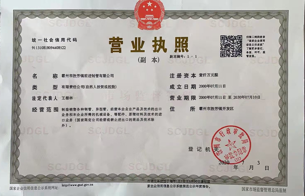 Bazhou Shengfang Town Qiandi Pipe Co., Ltd. 霸州市勝芳鎮前進制管有限公司位于河北霸州市勝芳鎮開發區,地處京、津、保三大城市中心地帶。北距北京120公里,東距天津45公里,西有京九鐵路,北有津保高速公路貫通。